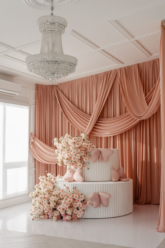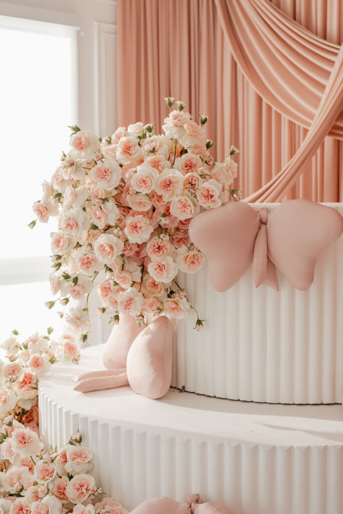 The Rosé Crème setup is a soft, powdery dreamscape designed to feel both playful and editorial. Delicately draped blush-pink fabric creates a light, airy cocoon, instantly elevating every photograph. At the center, a sculptural two-tier fluted “cake” platform anchors the set, adorned with tone-on-tone florals for depth and subtle movement. Satin bow pillows add a romantic, couture-inspired touch, balancing softness with structure.